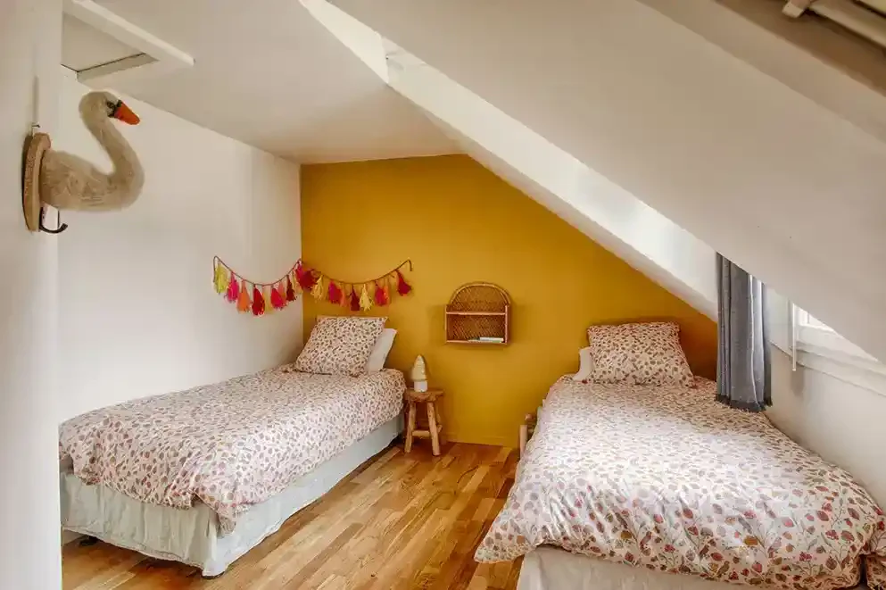 - ^- 2eme étage: Une plus petite chambre avec deux lits doubles (penderie, coffre à jouets pour les enfants).