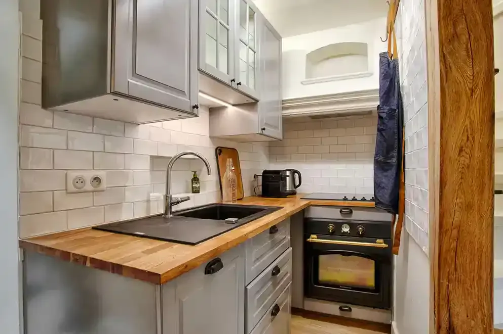 - ^- RDC: Une petite cuisine entièrement équipée (four, lave vaisselle, micro-onde, plaques, machine nespresso, bouilloire, et grille pain).