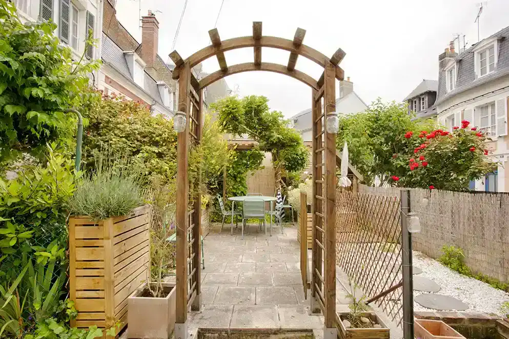 Un petit jardin/terrasse de 15 m2, privé avec un accès par la petite allée, face à la maison (présence d’une table et de chaises, parasol).