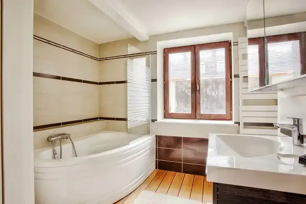 - ^- 1er étage: Une grande salle de bain avec une baignoire d’angle très spacieuse (présence d’une machine à laver).