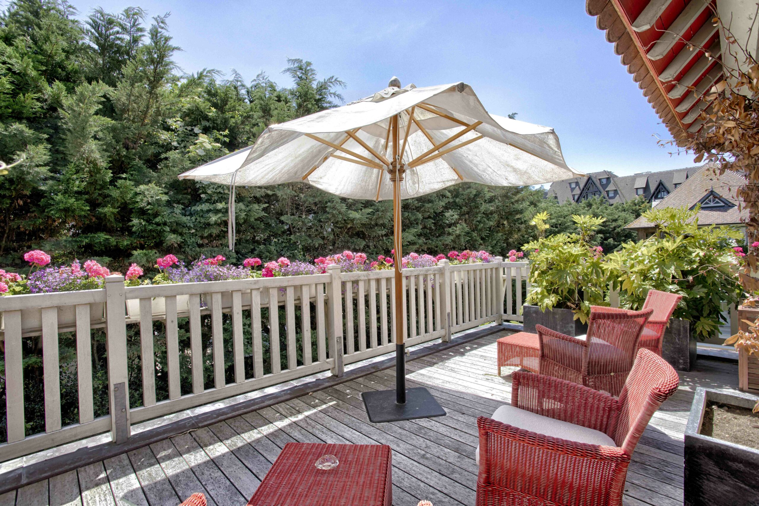 - ^- Grande terrasse avec mobilier de jardin, barbecue et table à manger extérieure, table de ping pong