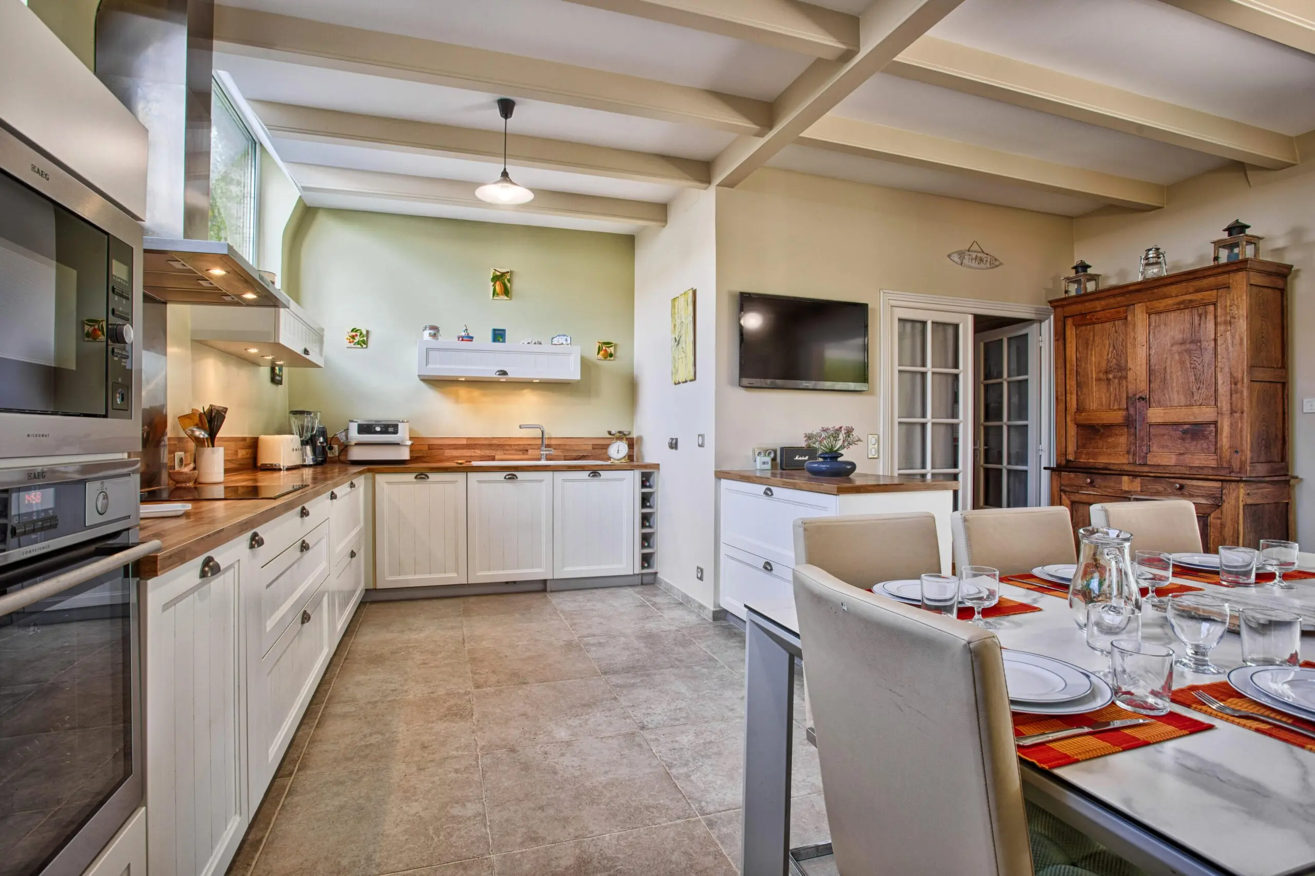 - ^- Cuisine totalement équipée et table à manger